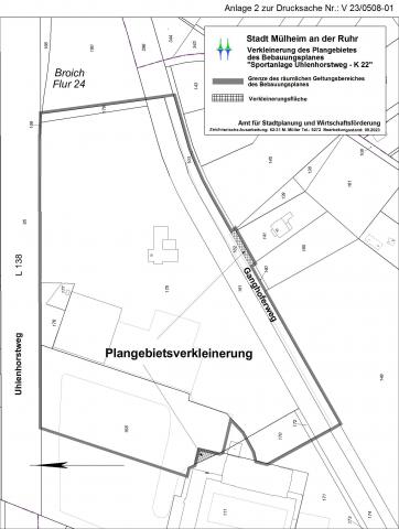 - Planungsrechtliche Sicherung der Sportanlage des HTC Uhlenhorst Mülheim e.V. nebst notwendiger Gebäude, Nebenanlagen, Einrichtungen und Stellplätze durch Festsetzung einer Fläche für Sport- und Spielanalgen mit der Zweckbestimmung Sportanlage Hockey und Tennis