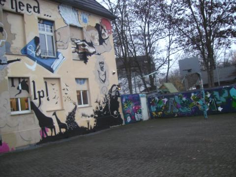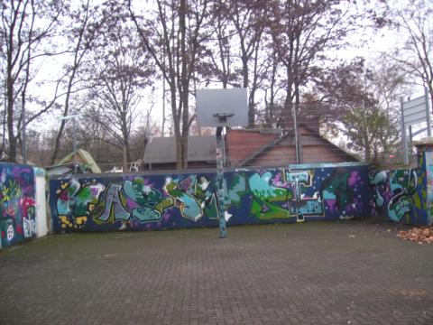 Ein einfacher Basketballkorb ziert das Jugendzentrum St Mariae Rosenkranz. Obwohl keine Linien und kein Netz vorhanden sind, wird durch die vielen Graffiti eine coole "Street-Atmosphäre" erzeugt.