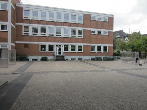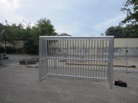 Eisentore mit Eisennetz auf dem Schulhof der Grundschule Zunftmeisterstraße bieten die Möglichkeit zu kicken.