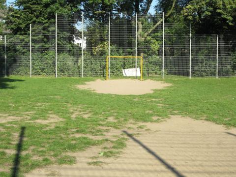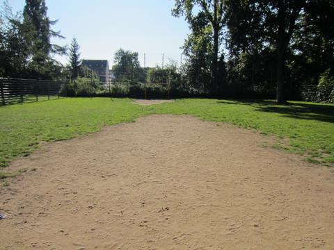 Der relativ große Fußballplatz hinter dem Spielplatz am Schloss-Styrum ist eine Mischung aus Rasen- und besonders an den Toren, Erdeplatz.
