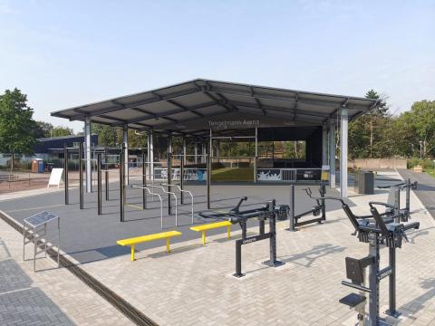 Die Calisthenics-Anlage ist das zentrale Element für alle Fitnesssportlerinnen und -sportler und wird durch weitere Trainingsgeräte und freie Trainingsflächen ergänzt. Alle finden perfekte Bedingungen für ihr persönliches Fitness-Workout. Der Fitnessbereich bietet sich besonders gut für Gruppen-Workouts an. Wir arbeiten schon an einem abwechslungsreichen Kursprogramm.