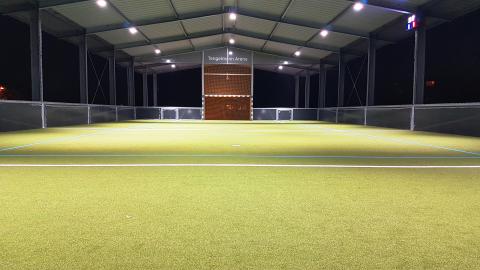 Gesamtfläche 15 x 40 Meter, davon 15 x 30 Meter mit einem Fußballfloor.