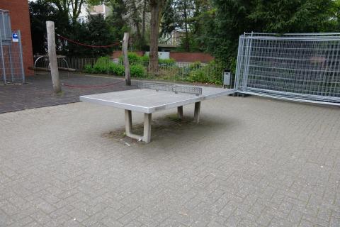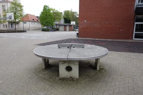 Auf dem Schulhof der Willy-Brandt-Schule befindet sich eine runde und eine normale Tischtennisplatte.