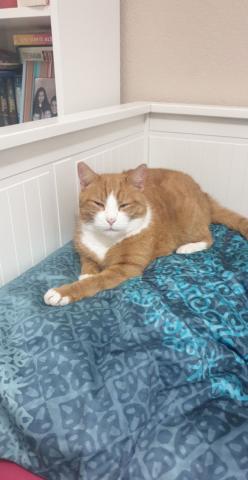 weiße Pfoten und orangenes/rotes Fell. Seine Schnauze ist auch weiß bis zum Hals und an seinem Bauch ist ein weißer Fleck, und im Brusbereich hat er auch weißes Fell. An der linken HInterpfote, hat er einen orangenen Fleck. Allgemein ist er getigert.