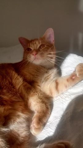 Sehr zutraulich aber schnell zu erschrecken. Braune Augen, weiße Schnurrbarthaare, kastriert, gechipt.