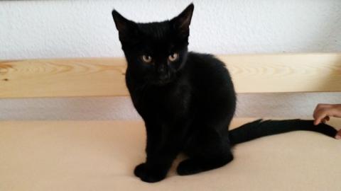 Sie ist komplett Schwarz mit schwarzen Halsband.
