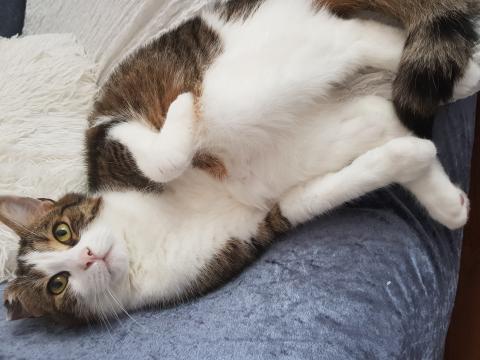 Selim ist etwas pummelig, hat ein kuschlweiches Fell, braun-grüne Augen und ein eingekicktes Ohrläppchen.