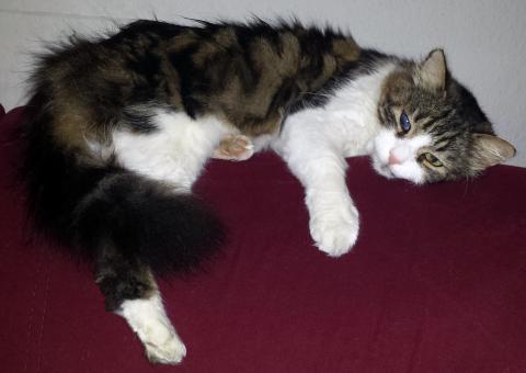 Dicker, buschiger Schwanz. Er ist Freigänger und draußen scheu und lässt sich, wenn überhaupt, nur am Kopf streicheln. Ansonsten greift er an. Am Schwanzende (letzter cm) hat er einen kleinen Knick im Schwanz. Kann man fühlen....