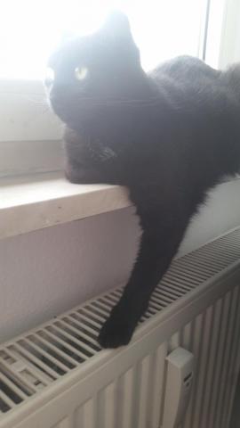 Zara ist eine Schwarze Katze, mit einer kleinen weißen Stelle am Hals. Auffällig sind ihre Beine, da sie dort wenig Fell hat.