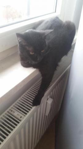 Zara ist eine Schwarze Katze, mit einer kleinen weißen Stelle am Hals.